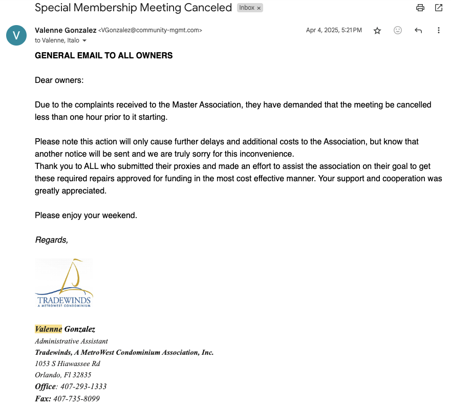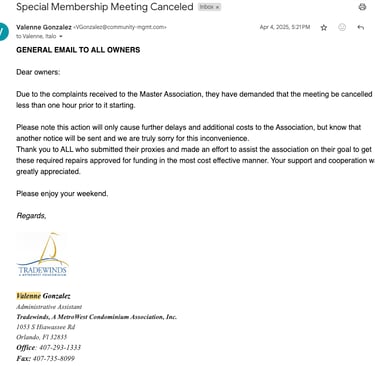 Email to homeowners from Valenne Gonzalez , Property Manager by Associa.